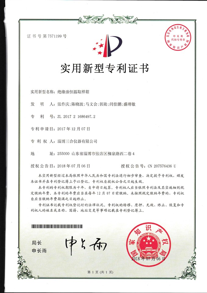 熱烈祝賀我公司產(chǎn)品“絕緣油取樣箱”發(fā)明專利獲得國家知識(shí)產(chǎn)權(quán)局授權(quán)。