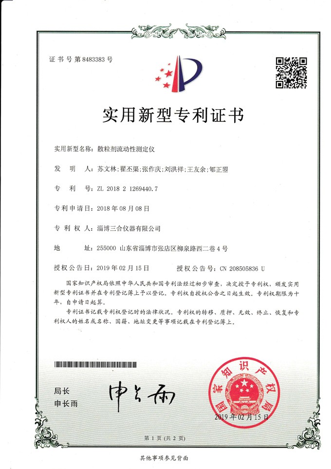 近日,我公司研發(fā)的《散粒劑流動性測定儀》已通過國家知識產(chǎn)權(quán)局的審批,獲得實用新型專利授權(quán)。這是繼《絕緣油恒溫取樣箱》取得專利之后,公司所獲得的又一項實用新型專利授權(quán)。